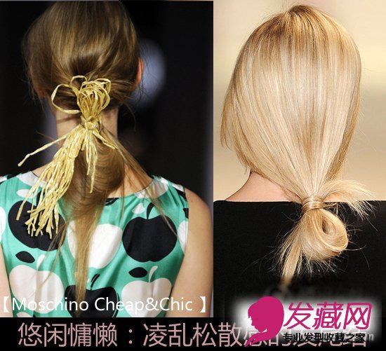这是一款很有东方古典之美的发型,将低扎的马尾在发尾的地方打一个活结,增加坠感的同时更增几分慵懒悠闲,来自Moschino Cheap&Chic秀场的有趣发型,将凌乱感的松散发尾活结与农场稻草发饰结合,更有田园悠闲气息。