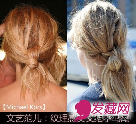 将打结的元素与马尾巧妙结合起来,在本季确实很流行,在Michael Kors秀场尽是交叉结马尾发型,让普通马尾变得更有时尚范儿。微卷长刘海×凌乱感发结,酷酷的随意发型,保持了低扎马尾的优雅贵气,同时又利用立体感细节装饰来增加文艺范儿!