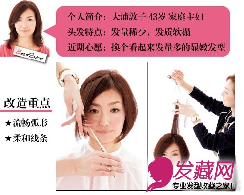 扁扁塌塌的发型一出门就背负着刚从厨房里溜出来的嫌疑,油头粉面的感觉让人看起来很邋遢,即使是家庭主妇也得好好收拾一下门面嘛!日本知名发型师根据大浦敦子的意愿,巧妙地将头发剪短,突出流畅的弧形,厚而齐的BOB头令整体造型提神了不少,看起来也嫩得像个小姑娘了!