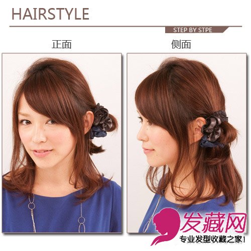 斜刘海与鬓角长发丝结合修出小脸,增添甜美感,而侧扎发髻展现个性。