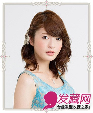第二款:斜刘海优雅甜美,侧边发辫编发搭配华丽发饰,展现出淑女气质。