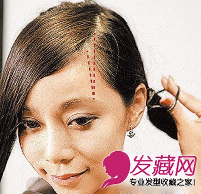 Step1:头发左侧分,分线约对齐左眼尾,头顶发丝预留,剩余头发往左绑成低垂的斜马尾。
