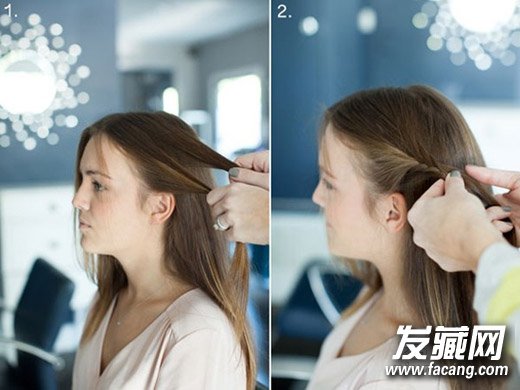 在耳际上方挑出一缕较细的头发,一分为二,左右手各抓住一缕头发,分别为AB,用食指和拇指在A中新挑出一缕,以同样的方法在B中也挑出一缕,两缕细发交叉相叠,以此类推进行编织。