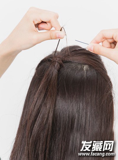 step4:再用一束头发缠绕橡皮筋并用发夹固定。