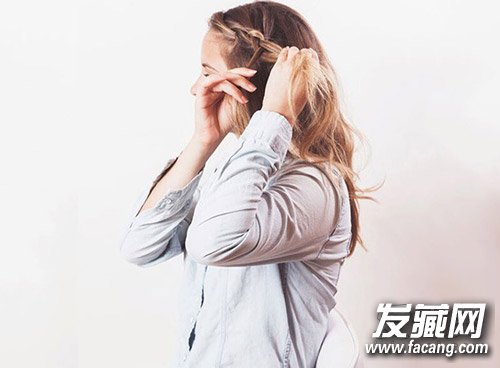 step2:如图,从前方开始编织鱼骨辫,不断加入头顶上方的头发。
