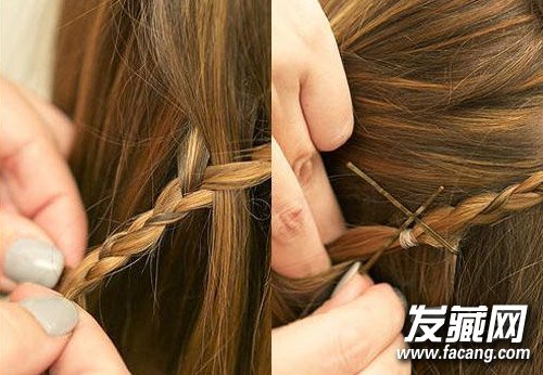 step6:掀开外层头发,将编发隐秘的藏在内侧,用小发夹加以固定。