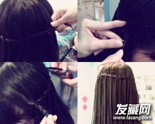 步骤七:然后进行三股辫编发,把瀑布辫垂直编进来,编制成细细长长的三股辫造型。