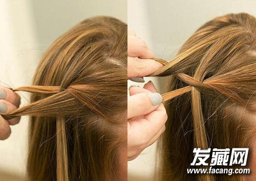 step2:完成一股编发后,一只手抓住最底层发束,另一只手抓取后侧适量发束,如图压在最上方;