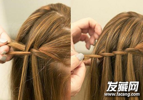 step3:放下新加入发束,如图进行交叉编织,完成第一束瀑布式编发;