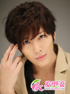极具浓郁的韩国风情的一款男生发型,整款发型打造的亮点在于发顶的层次卷发造型,让男生看上去更加的斯文帅气!独特的发型设计从脑后一直延伸到前额,细碎的斜刘海设计微微遮住眼帘,使得男生多了一份俊俏感,独特的鬓角设计也和贴合瓜子脸!搭配裸色西装,简洁大方!