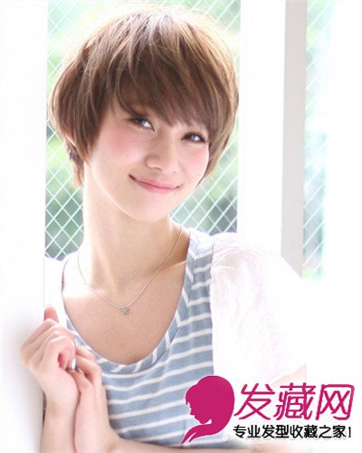 超短利落发型,前面过眼睫毛的偏长刘海,盖住全部额头,显得率直清新,柔顺服帖的贴紧额头,带来几分可爱羞赧的感觉