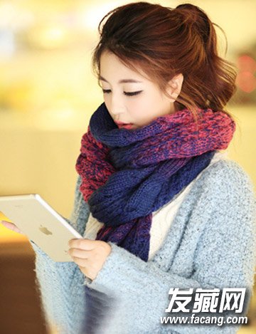 学习韩国妹纸们,轻松搭围巾技巧,洋溢出甜美潮感,随意绑扎的渐变色粗围巾,配上可爱的高马尾