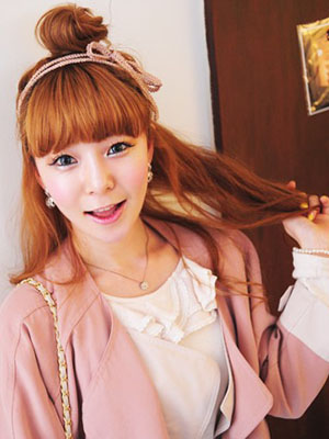 金棕色的染发在人群中显得备受瞩目,厚重的齐刘海修剪出细微的弧度有助于修饰脸型轮廓线条。取头顶适量的发线扎在出丸子头,令造型迅速升级,下层的长烫发依然飘逸。将双层的细绳发带装饰在发型上,扎成蝴蝶结提升甜美系数。