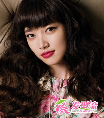 厚重的长发烫发制造出泡面的波浪弧度,利用吹风技巧吹出时尚、大气的感觉,齐刘海遮盖住额头,突显小巧脸颊。