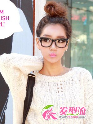 类似丸子头的发型突显出清爽的造型感,将发丝归拢随意扭绕盘在头顶,利用梳子逆 刮发髻制造出毛躁感,搭配黑色边框眼镜可以增添造型度。喜欢彩妆的MM不妨利用粉紫色的口红 来点缀妆容,令气质显现得更加甜美。