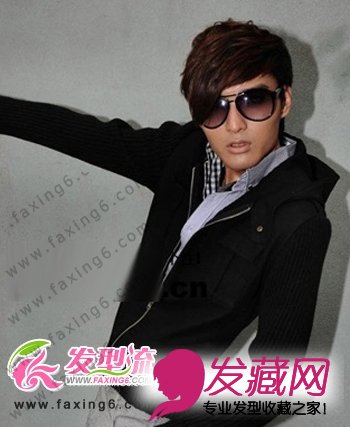 额际大片的斜刘海让男生更具有男人味,头顶部分的发丝制造出纹理烫的效果,时尚又大方,深栗色的染发又彰显出男生的成熟稳重的气质,墨镜的搭配,十分具有男人味。