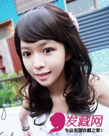 厚重的刘海,耳朵以下的卷发,使视线范围收窄于这两者之间,减短脸型的长度。