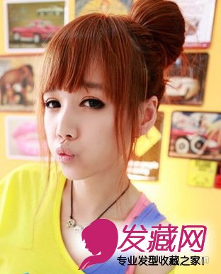 可爱的韩式丸子头发型,犹如精灵般可爱迷人,高高扎起的丸子头造型,给人带来青春活力的感觉,加染上红棕色的染发,韩式丸子头发型又显得更加时尚洋气,齐刘海发型的两侧故意余留的几缕发丝,极具自然甜美风情。