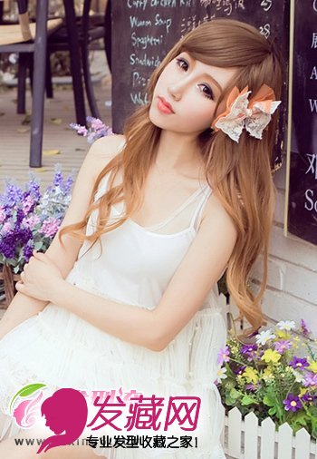 ,使女生的五官更加富有立体感觉,随肩散落的卷发发型,很有优雅自然的气息,别上一个蝴蝶结发饰,增添女生甜美气息。