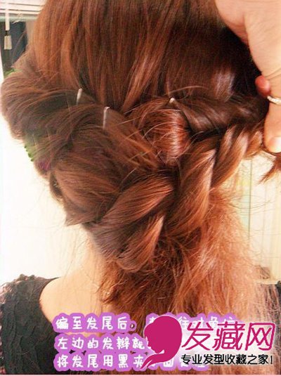 编至发尾后,直接往对角拉,左边的发辫就拉直右边,将发尾用黑色夹子固定住