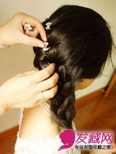 步骤五:在编发发股的交叉处镶上几颗小巧精致的发簪会更有韵味哦!