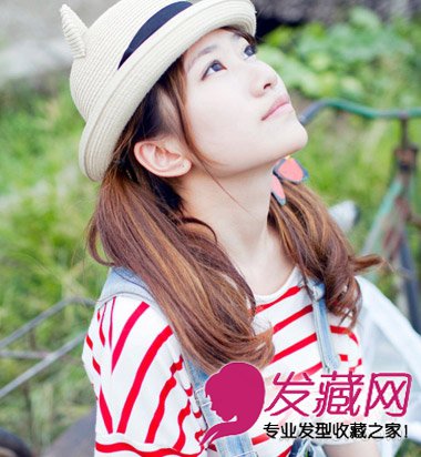 随意自然的双马尾扎发,可以让你变得更加平易近人,将两边的头发分成两边,随意性的扎起,戴上圆形帽俏皮可爱,是款可爱