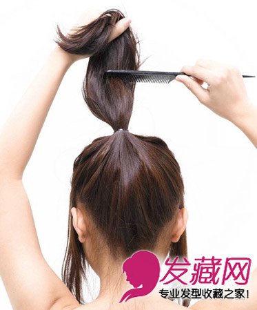 step3:用密齿梳将马尾的头发倒梳,由发尾梳向发根,这样头发变蓬松,发髻会更大。