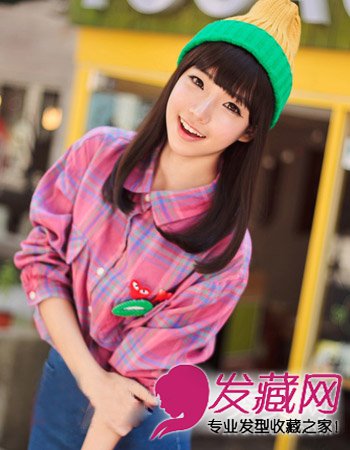 发型发尾内扣十分甜美,造型柔顺有个性,齐平的刘海搭配上帽子十分抢眼,凸显出小女生的灵动来。