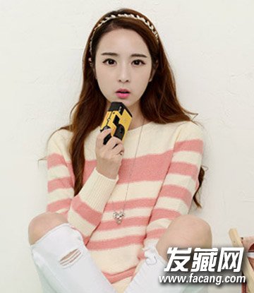 ,偏分的露额长发随性披散肩上,深棕色染发的长发很有韩范儿,搭配发饰清甜可人。