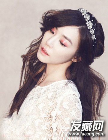 颇有时尚感的一款写真发型, 不对称的发型设计加上长发烫发的处理勾勒出无比的气质来,公主半扎发点缀上发饰十分有气质,红色眼影更显时尚。