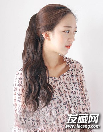 卷发扎成的俏丽马尾辫,清爽又甜美,无刘海的设计更是显得很清凉,非常适合夏季的一款发型设计哦。