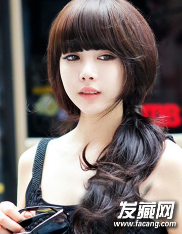 厚重感刘海加上气质的侧边扎发发型,也不失为一款个性的造型设计哦,而且蓬松的卷发马尾十分有个性。