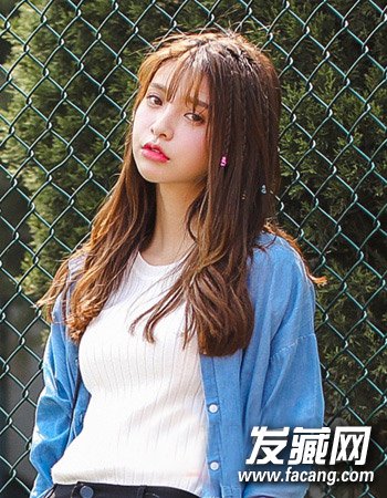 同样以明亮的橘黄色染发颜色来衬托出女生的青春活力感,再搭配韩式空气刘海造型与简单的中长
