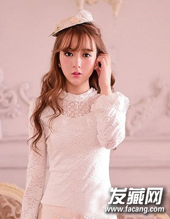 采用的是时尚的棕黄色染发颜色,再搭配韩式空气感刘海的造型设计与长发形式的微烫造型,简单的帽子装饰更添温柔淑女风。