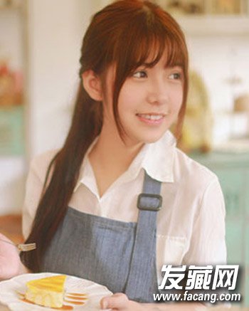 时尚甜美的韩式长发扎法,齐刘海长直发扎简单的公主头半扎发,自然披肩的长发配合空气刘海设计更显呆萌气质。