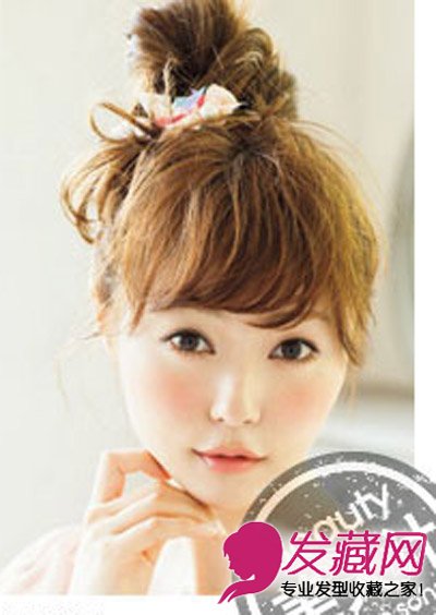3、卡上彩珠小发饰作装饰,轻轻用手撕的方式将花苞头抓出适量的蓬松感,整个造型就完成了。