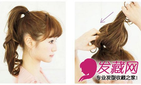 2、拉起马尾,并卷曲马尾部分的头发,方向从上往下,把马尾平均分成左右两束。