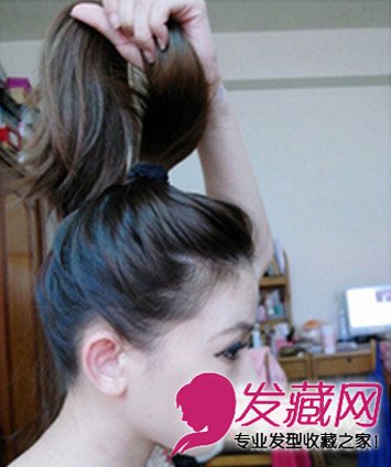 扎好头发之后,再将头发拿起,将整个马尾拉高,像图中的MM一样,从中间部位向上拉。