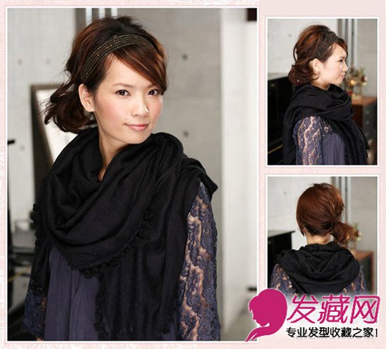 发型点评:棕色长发扎成蓬松的侧边花苞头,配上一根宽边发带,让你整个造型低调闪耀。