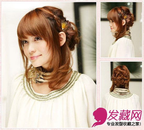 发型点评:这款发髻复杂而别致,点缀的小小黄色发饰甜美吸睛,轻垂下来的卷发更显妩媚。