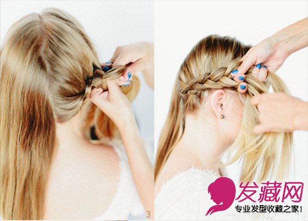 STEP2 三束头发编成紧致的麻花辫,同时加入新的发束继续沿着耳侧编辫子。