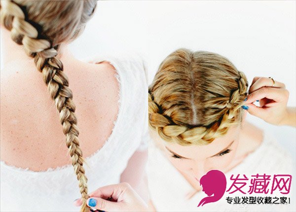 STEP5 继续编织成一条长长的麻花辫直至发尾,最后将编好的辫子围着头顶缠绕,绕至发尾处用发夹固定在发圈中,这款花环编发完成,很别致的一款