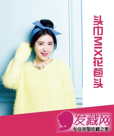 style2:蓝色头巾活力十足,中分长刘海自然的修饰脸型,搭配着花苞头造型,显现出可爱俏皮的气质。