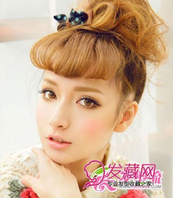 将长发卷发盘绕在头顶,发尾向上散开如含苞欲放的花朵,绽放出最美艳的姿态。稍短的刘海做出略弯的弧度,让发型显得空气感十足。少不了的就是头饰的点缀,利用与染发颜色相配的发饰,能提升发型的甜美度,造型更加漂亮!