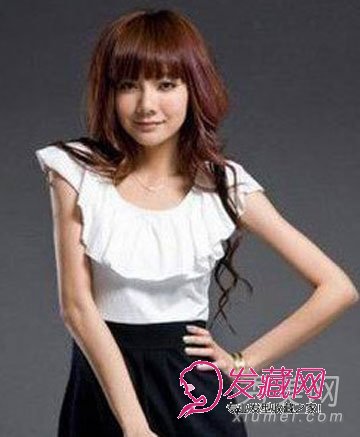 整齐的一字齐刘海配合卷发上部轻微外翻的设计,整体线条打造成了非常甜美与流畅的弧度。而卷发中部至尾部加强外翻卷发弧度,使外翻从上到下是一个从自然到精致的效果渐变。配合暗红色的染发,走到哪都会是一个闪耀的芭比公主。