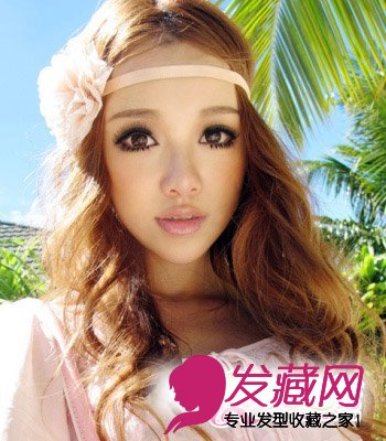 如果你拥有尖细而精致的瓜子脸型,那么中分发型想必很适合,衬托出你的妩媚风情。浪漫的卷发结合了外翘、内卷的弧度,让造型尽显唯美气息。利用花朵发带环绕额际,点缀如神话故事中女神的典雅气质,是一款很适合去海边度假的发型哦!