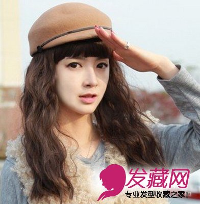 如果脸型小巧的女生,可以将卷发弧度做的细致些。中长发的长度搭配卷发释放出小女人的妩媚感,刘海修饰了脸型又可以减龄,不用担心卷发会让人看起来显得过于老气的烦恼。搭配能突显出自己个性的帽子,提升了造型度。