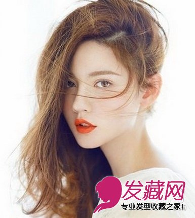 这款女生长卷发发型特别之处是将一侧所有的头发绕过头顶,梳向一边,营造出女生大分头的性感感觉,栗黄色的染发颜色增加了大卷发发型的光泽度,一侧散落的几缕发丝,以及鲜艳的唇色,都增加了卷发发型的魔力。