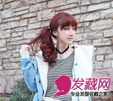 清纯派韩系学院风,酒红色染发很衬肤色,斜扎马尾更显朝气活力