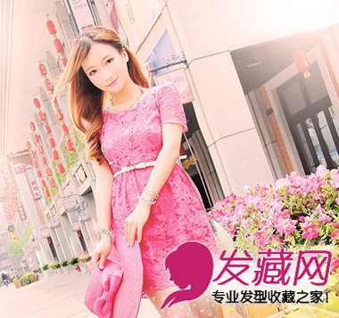 侧分栗红色螺旋卷发,精巧的卷度迷人又清新,粉色蕾丝连身去你复古可爱